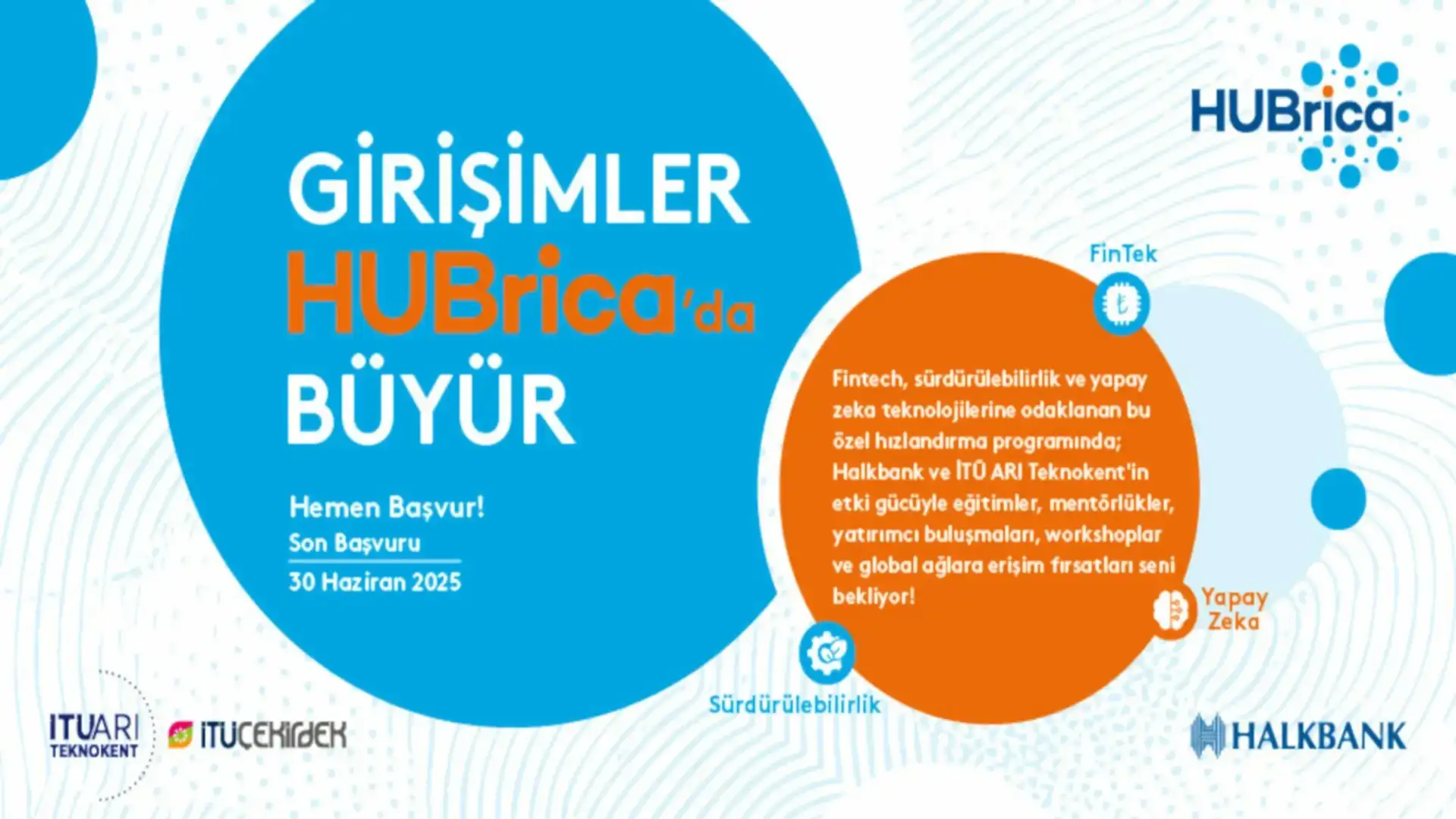 Halkbank ve İTÜ ARI Teknokent, girişimcilik ekosisteminin potansiyelini artırmak ve farklı sektörlerde yeni atılımlara alan açmak amacıyla önemli bir iş birliğine imza attı. Bu iş birliği kapsamında, HUBrica Hızlandırma Programı, bu yıl İTÜ Çekirdek aracılığıyla yürütülecek. Halkbank ve İTÜ ARI Teknokent, fintek, sürdürülebilirlik ve yapay zekâ alanlarında çalışan girişimcilere özel bir hızlandırma programı hayata geçiriyor. Programa son başvuru tarihi ise 30 Haziran 2025.